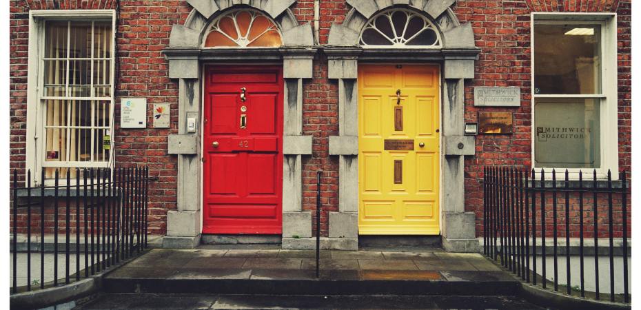 Image of a brick building with stairs up to a red door and a yellow door side by side