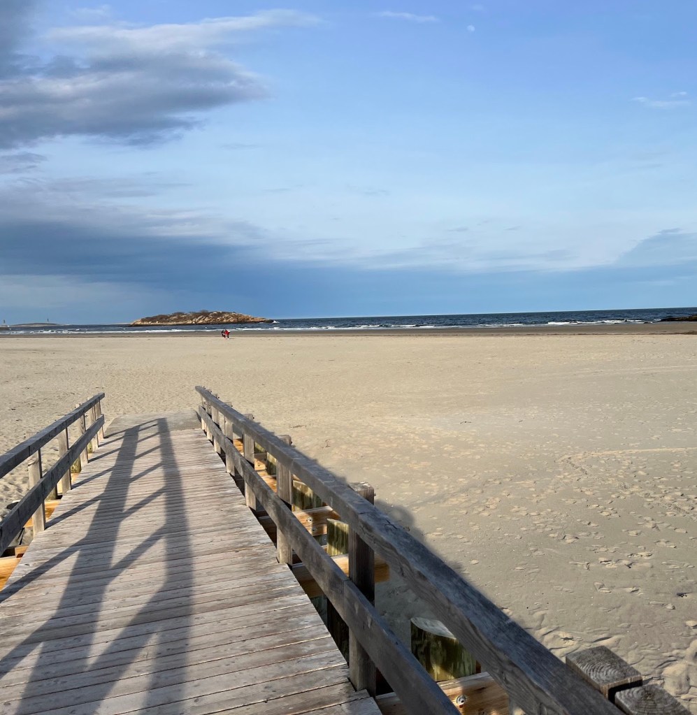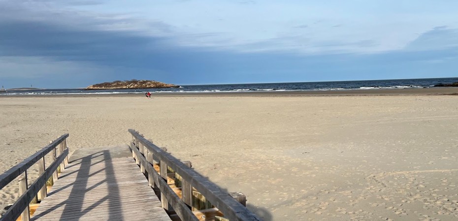 Image of rocky, sandy beach with water in background and woman staring pensively into the distance (no, it’s not me)