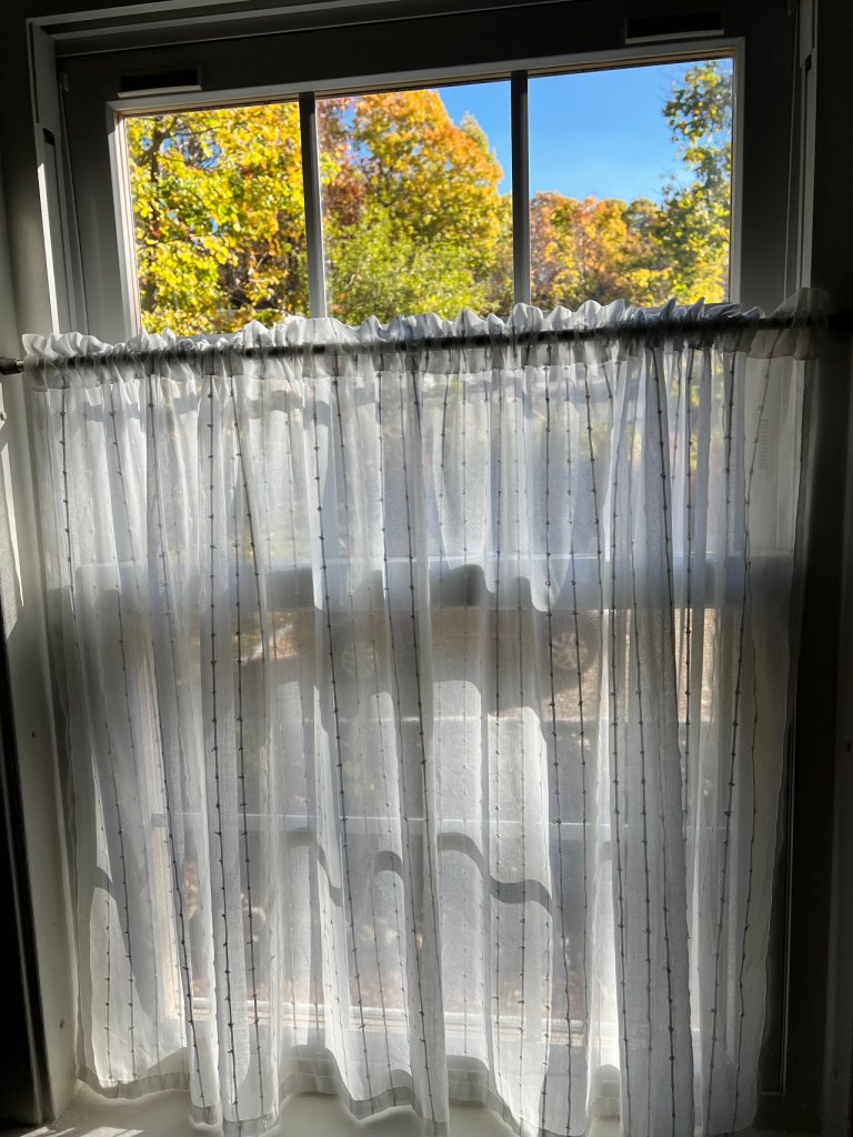 Image of thin white curtain over 2/3 of a window, at the top you see trees with yellow, green and orange leaves