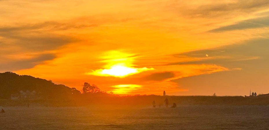 Image of bright orange sunset over the sand with obscuring clouds and mist