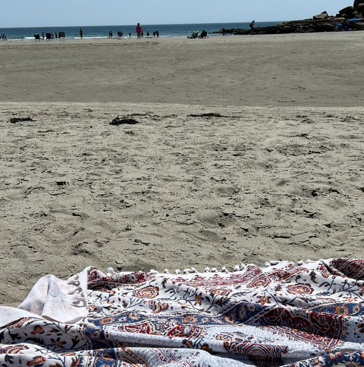 I had one of those moments yesterday where I had to shake my head a little and see if there was anything inside that jiggled since I clearly didn’t have my full thinking cap on. It was going to be a hot day. Well, hot for here anyway about 80. Also a Sunday, on a holiday weekend, the first of the beach season. So people galore. So I immediately thought, ok no beach until at least 4:30. And then wondered, why? It was 10:30, already pleasantly warm for the beach, so I sprayed on some sunscreen, got the beach stuff together and did my short walk to the beach. Yes, peopled, even before 11 on a Sunday, but plenty of spots on the squishier sand without having to be on top of anyone else or have someone’s kid kick sand onto you as they walk by.